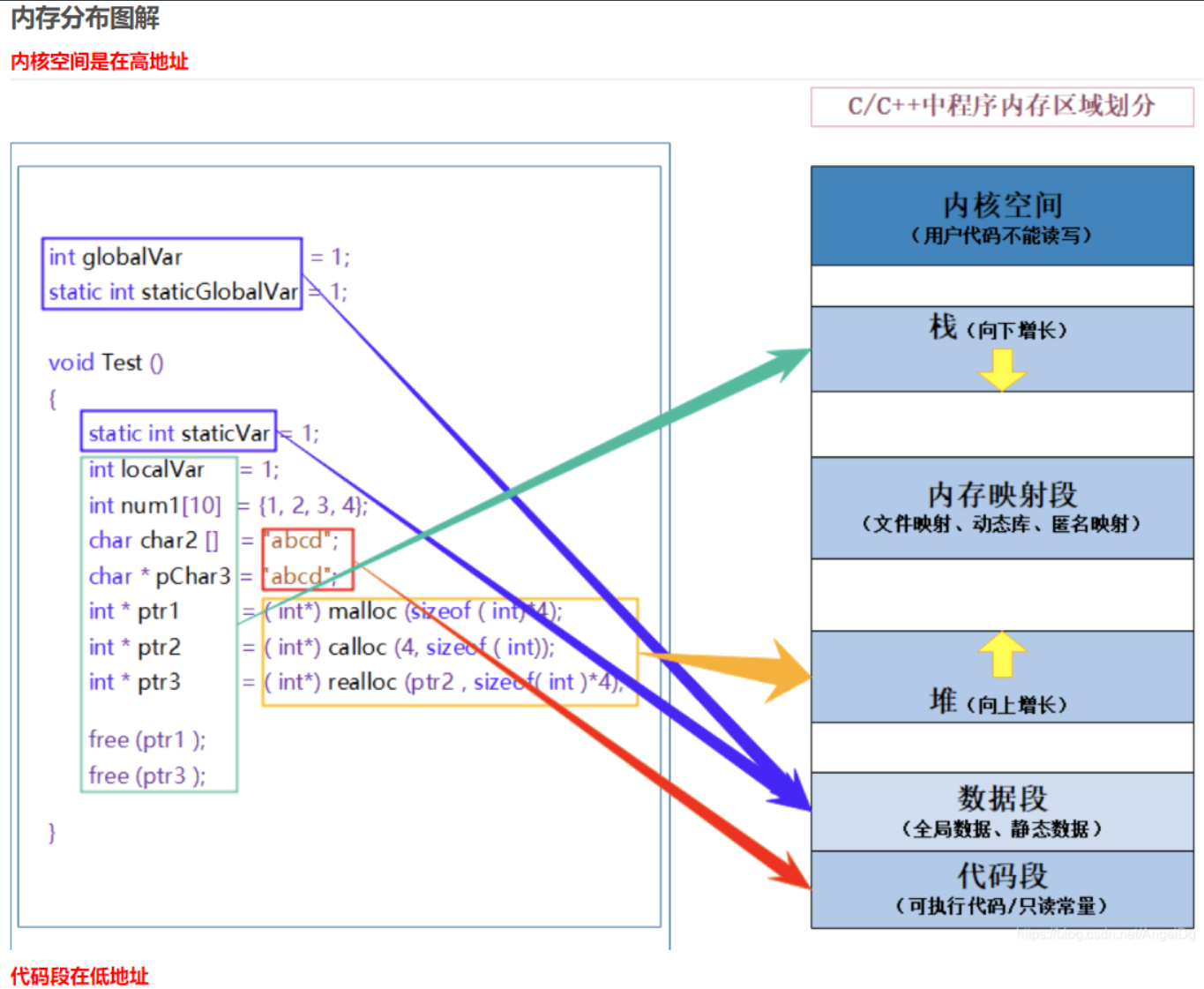 这里面有错误,char char2[] = "abcd"; 这里的"字符串不是字面值常量",不是放在代码段的,而是放在栈中的(可以进行修改)